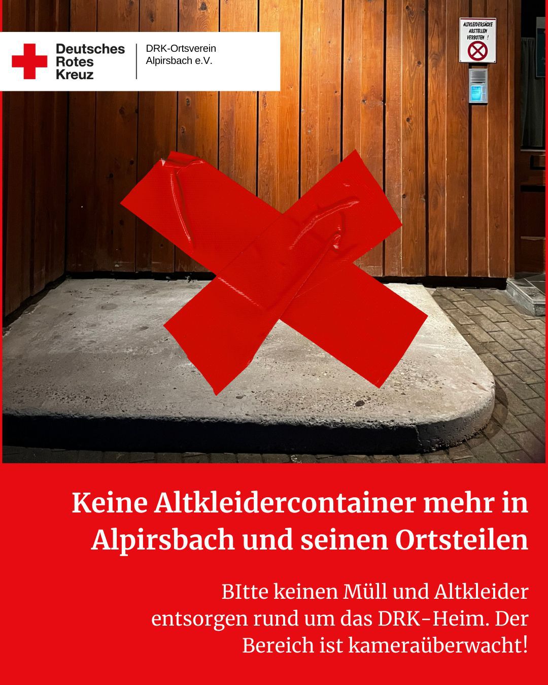 Ab sofort stehen keine Altkleidercontainer des DRK mehr im Gemeindegebiet Alpirsbach zur Verfügung. Bitte nutzen Sie den Kleiderladen des DRK in Freudenstadt oder informieren Sie sich beim Abfallwirtschaftsbetrieb des Landkreis Freudenstadt. Müll und Alkleider abladen rund um das DRK-Heim ist verboten. Der Bereich ist kameraüberwacht.
