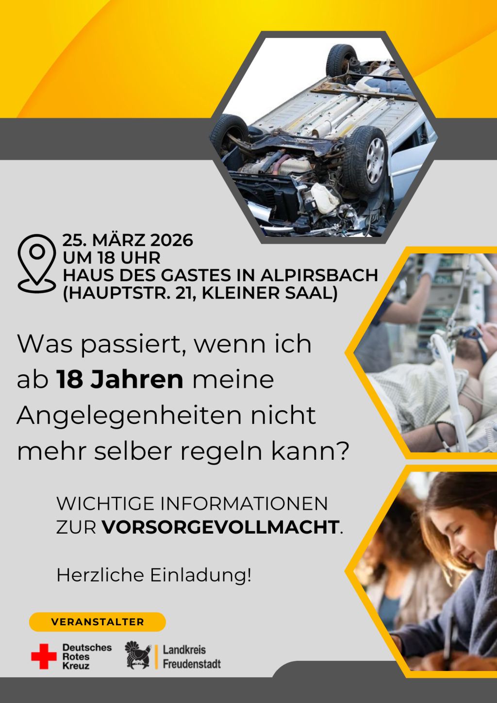 Der DRK OV Alpirsbach e.V. lädt die Bevölkerung in Zusammenarbeit mit dem Betreuungsverein des DRK Kreisverband Freudenstadt und dem Landratsamt Freudenstadt herzlich ein zu einem kostenlosen Vortrag zum Thema "Vorsorgevollmacht, rechtliche Betreuung und Patientenverfügung" am Mittwoch 25. März 2026 um 18 Uhr im Haus des Gastes in Alpirsbach, Hauptstraße 21, kleiner Saal .